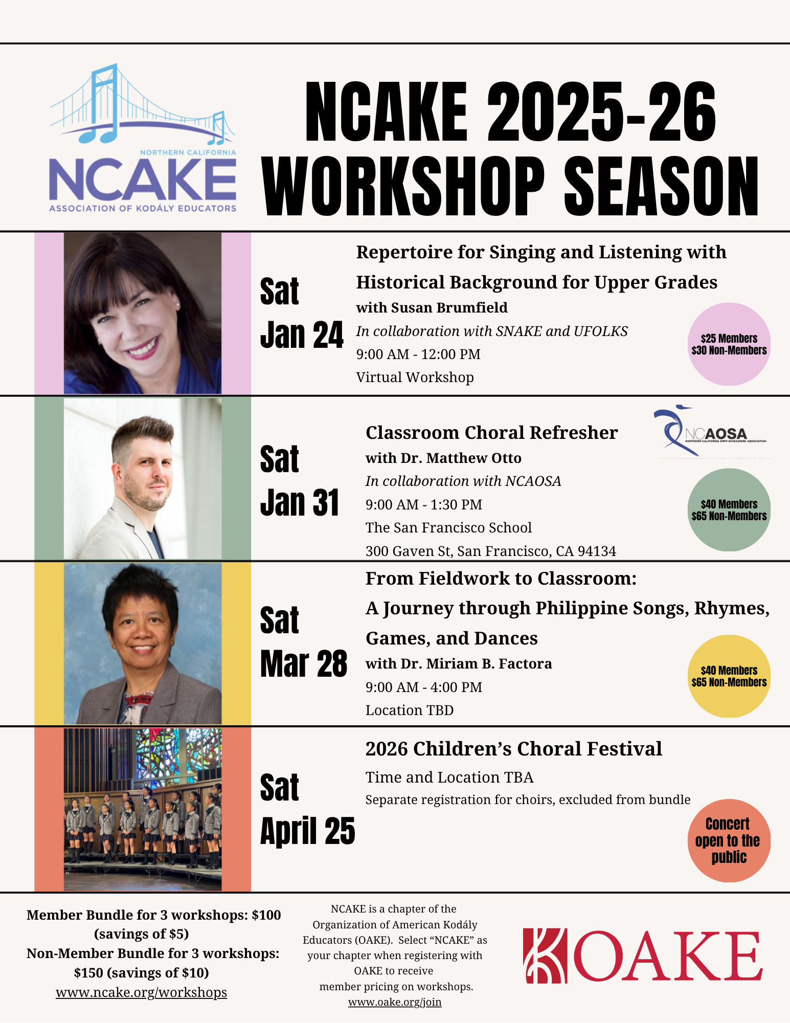 NCAKE is thrilled to announce our workshop offerings for the 2025–2026 school year! Join us for an inspiring series of professional learning opportunities designed to connect, collaborate, and grow alongside fellow music educators.