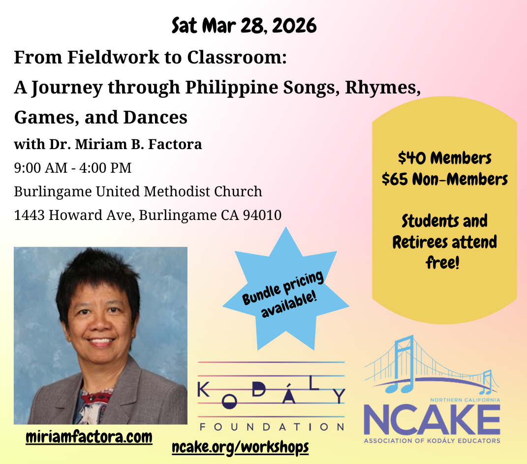 NCAKE is thrilled to announce our workshop with Dr. Miriam B. Factora. This workshop will feature materials she has collected from various regions of the Philippines, highlighting her journey in developing rich educational and cultural resources. Participants will engage in interactive activities that include exploring key musical examples, listening to select field recordings, and performing sample songs, games, and dances.